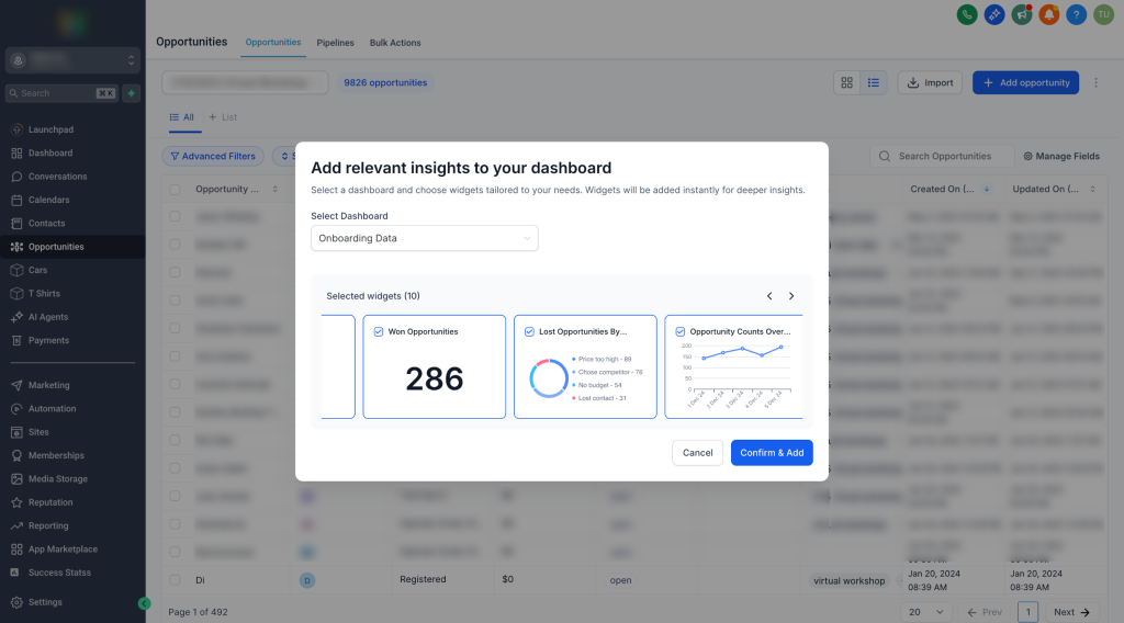 You can now add relevant insight widgets to your dashboards directly from key pages — making it easier to bring analytics into your workflow without switching context.
